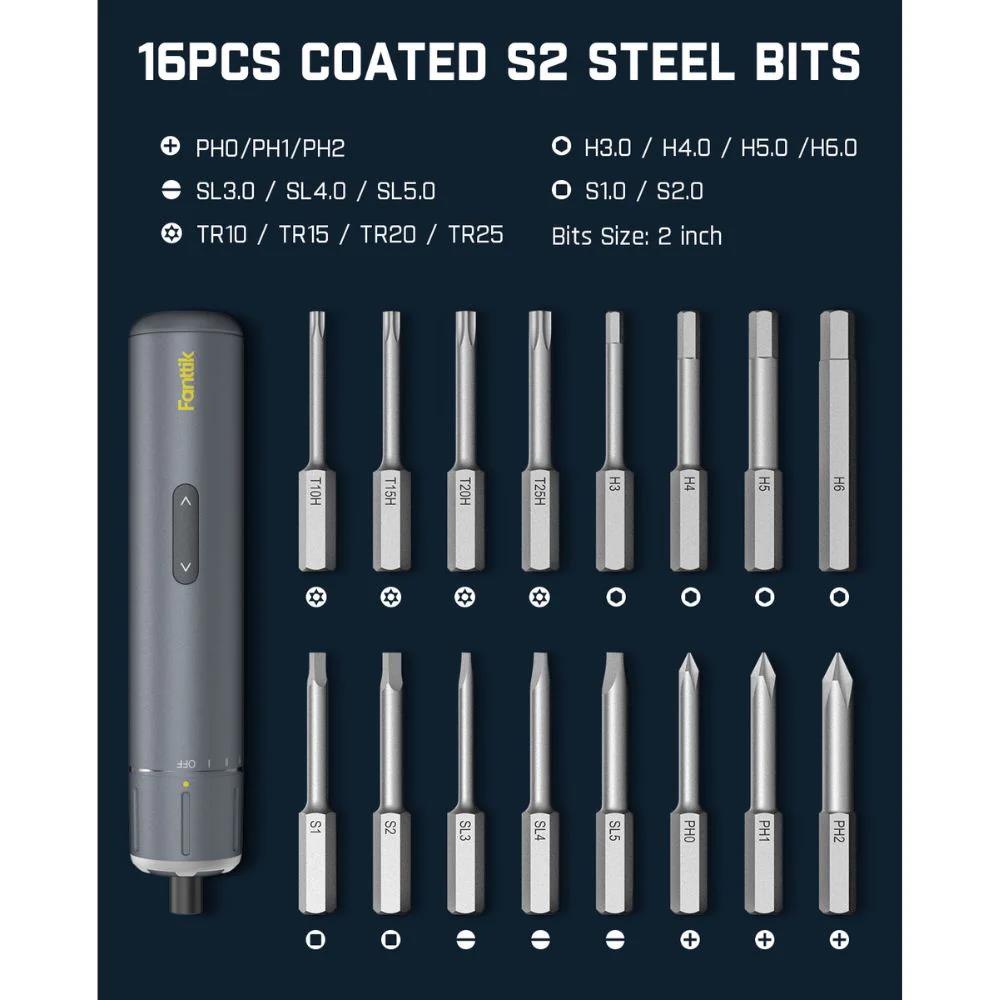 Con 50 punte di 9 categorie, il mini cacciavite elettrico Fanttik può prepararti per una varietà di Dotato di 3 livelli di coppia di 1,5/3/4,2 Nm e coppia massima di 6 Nm, nonché una coppia manuale di 8 Nm. Arresto immediato nel momento in cui il dito si solleva, lavora in modo intelligente e non duro. Questo potente cacciavite elettrico offre forze di coppia precise per le tue esigenze di lavoro pratico. Ideale per il montaggio e la riparazione di mobili, condizionatori d'aria, rubinetti, prese elettriche, computer desktop, ecc.