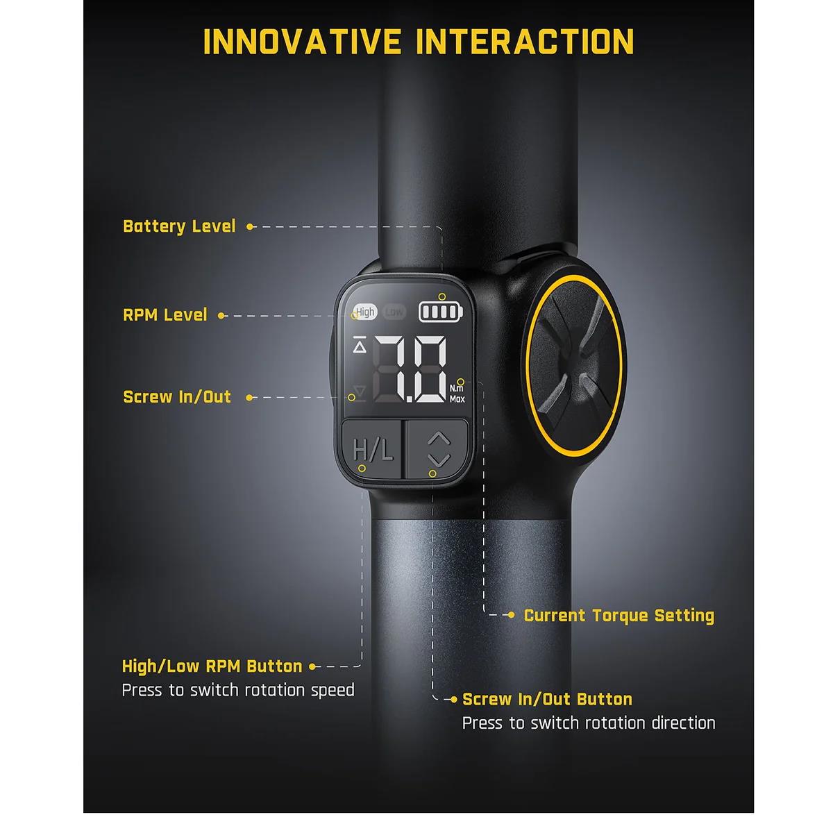 È possibile regolare la coppia tramite l'anello di coppia con 8 impostazioni per garantire la precisione e monitorare visivamente i livelli di coppia in tempo reale sullo schermo. Ciò fornisce prestazioni più precise e professionali in vari compiti.