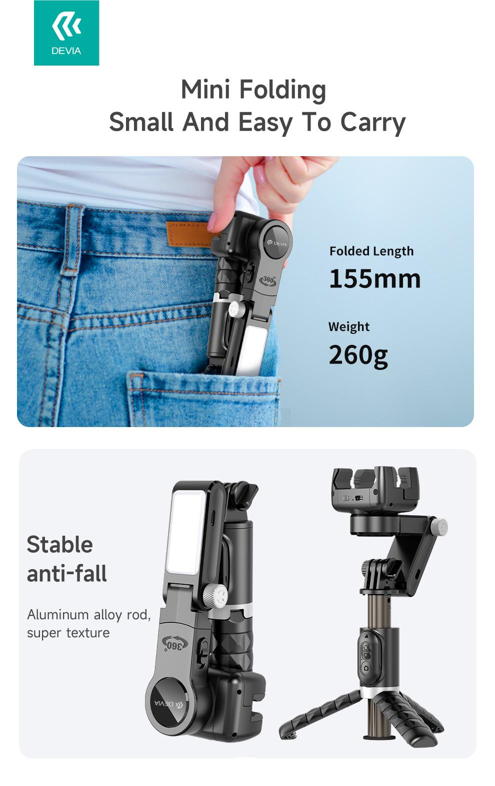 Il selfie-stick cardanico desktop multifunzionale con supporto per treppiede My Devia è un prodotto rivoluzionario che porta la fotografia e la videografia a un livello superiore. Con le sue funzionalità avanzate e il design intuitivo, consente agli utenti di acquisire facilmente foto e video di qualità professionale.