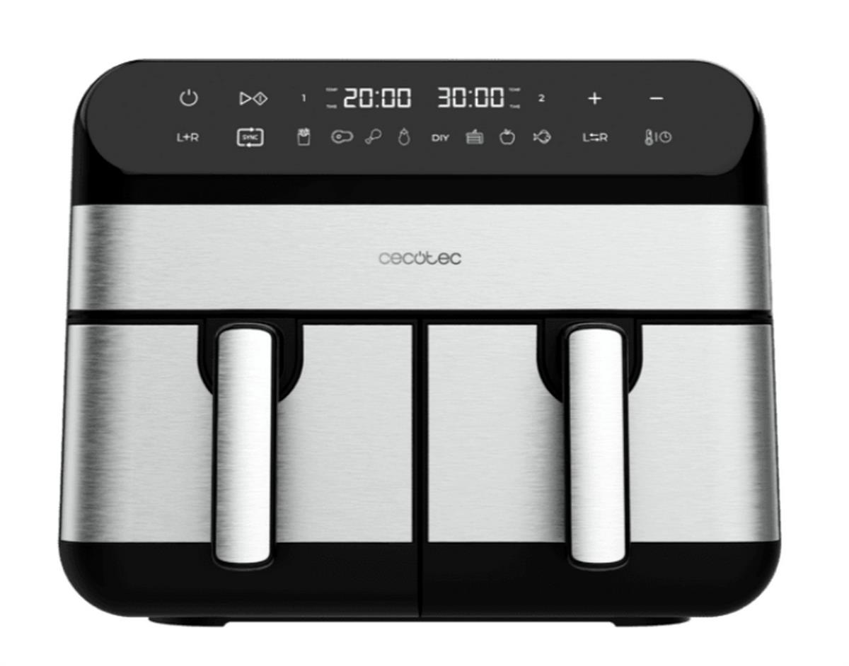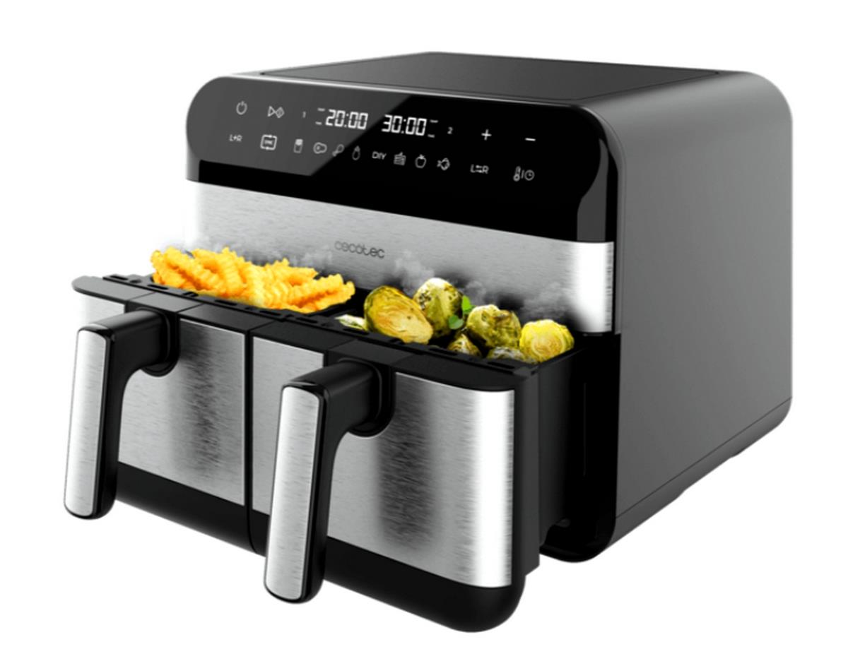 Capacità totale 9 l., doppio cestello da 4,5 l., impostabili due temperature e due timer diversi, per cucinare due pietanze contemporaneamente e in modi diversi.