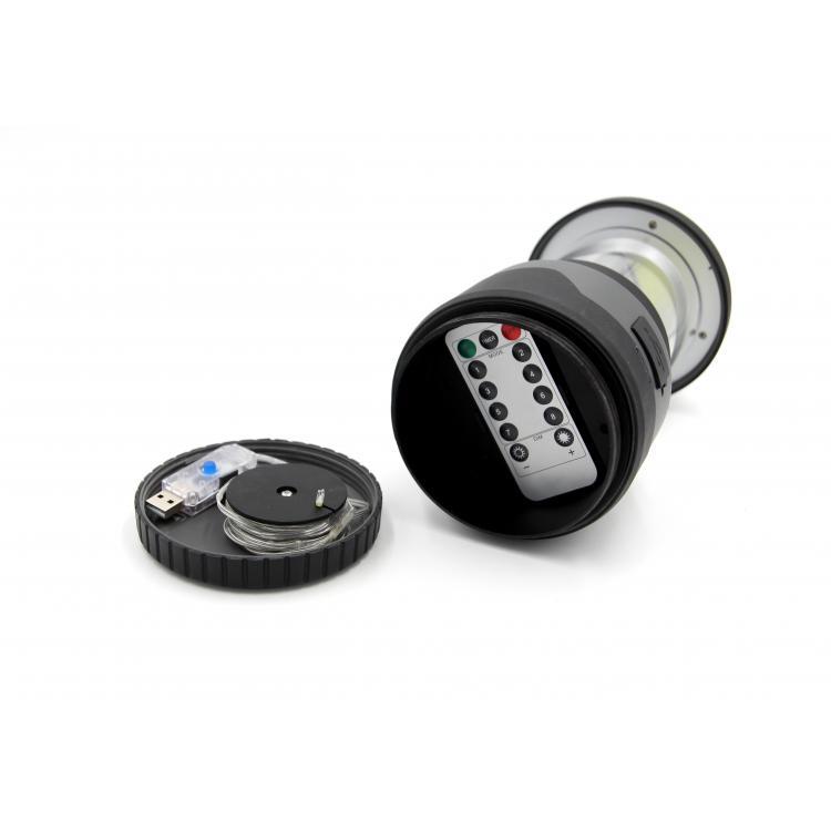 Catena luminosa RGB da 5m inclusa, con telecomando e alimentazione tramite l’uscita USB della lanterna.