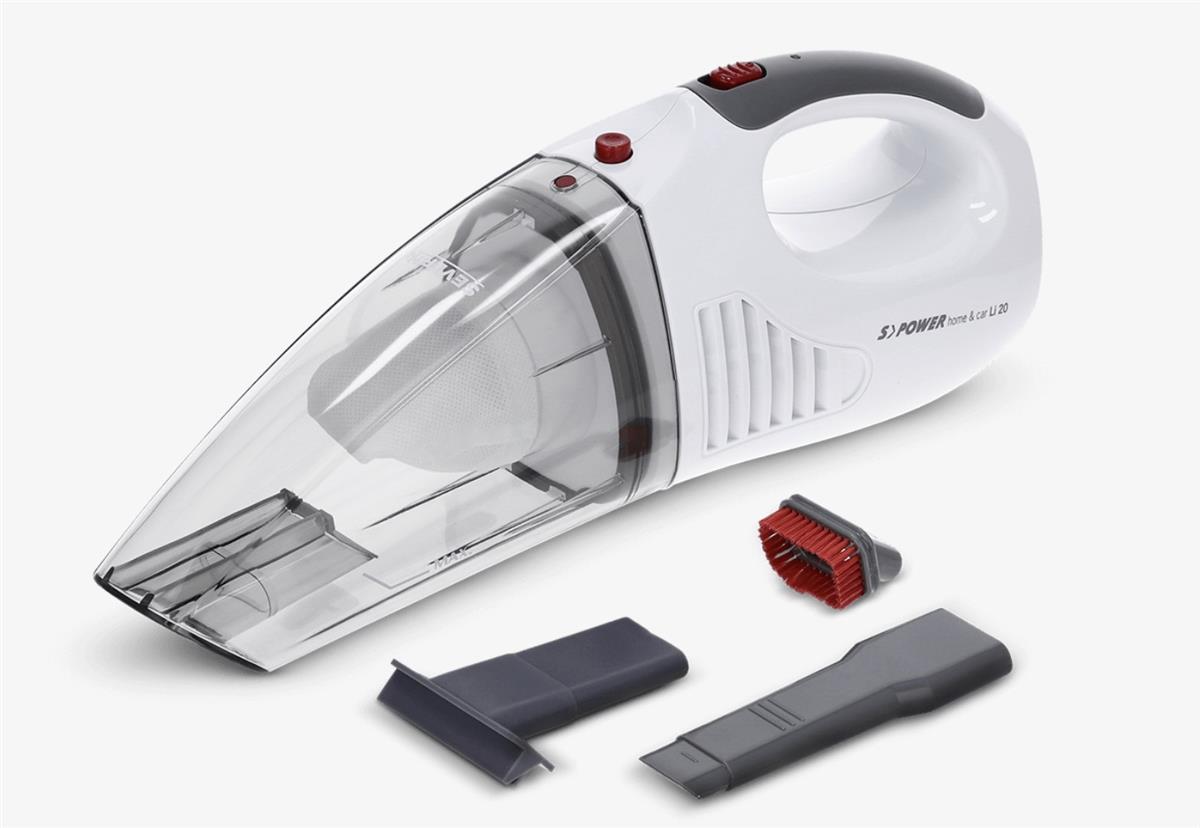 Aspiretto solidi e liquidi ricaricabile 3 in 1 «S'POWER® home & car Li 20», batteria agli ioni di litio (7,4 V / 2.000 mAh), capacità del recipiente: 200 ml per la polvere, 100 ml per i liquidi, autonomia: 18 minuti, interruttore On/Off, spia luminosa per il controllo della carica, protezione dalla carica e dalla scarica eccessiva, Accessori in dotazione: ugello in gomma per aspirare liquidi, spazzola per giunti per pulire punti difficili, supporto a parete con dispositivo di ricarica, cavo di ricarica a 12 V per l'accendisigari.