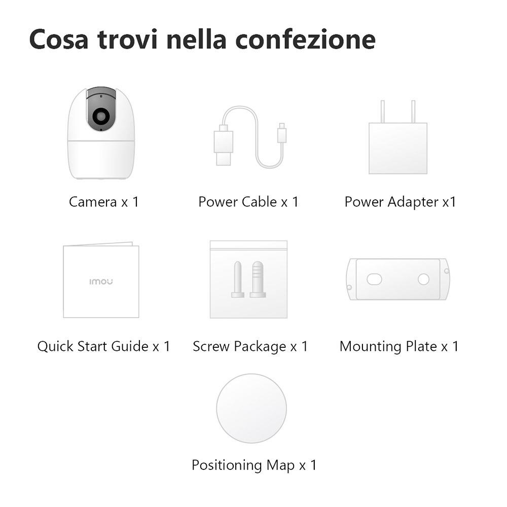 PAN 355° e TILT 80°, 1 porta LAN 100 Mbps, Wi-fi IEEE802.11 b/g/n portata fino a 50 m in campo aperto, app imou per iOS e Android,