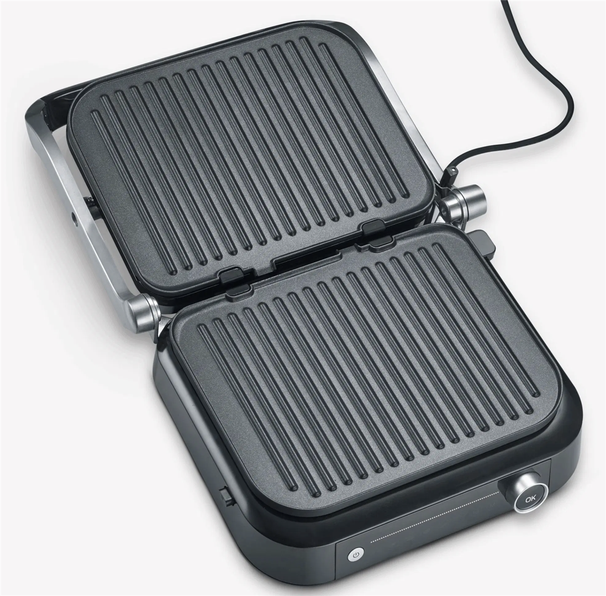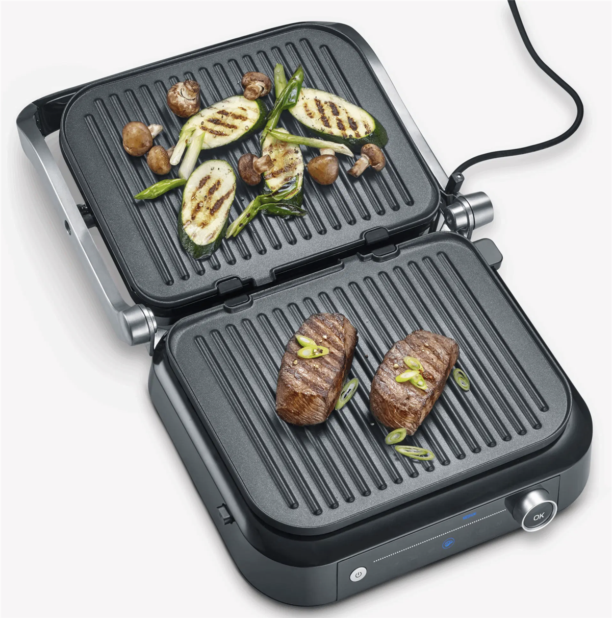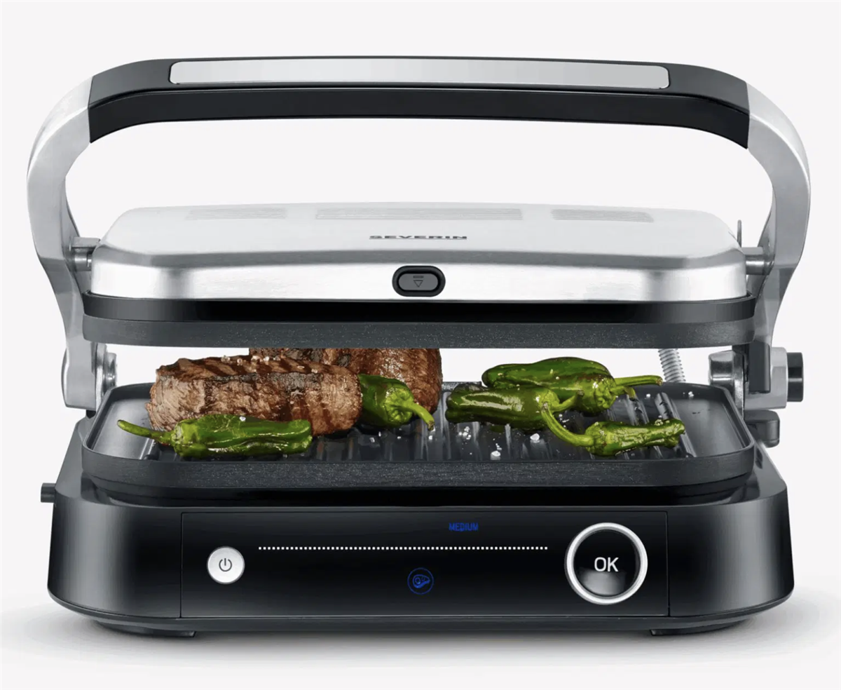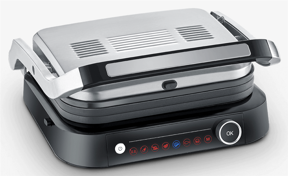"Bistecchiera Potenza: 1.800 W, Temperatura max: 230°C, superficie di cottura : 31,3 x 24,5 cm, 7 diversi programmi automatici ed 1 manuale. Il sensore rileva lo spessore del cibo e indica il raggiungimento dei diversi livelli di cottura. Può essere utilizzato sia come bistecchiera che come grill da tavolo, grazie alla superficie apribile a 180°.Semplice da pulire grazie alla facilità con cui si possono rimuovere le piastre di cottura, lavabili anche in lavastoviglie .Interruttore accensione. Vaschetta raccogli grasso