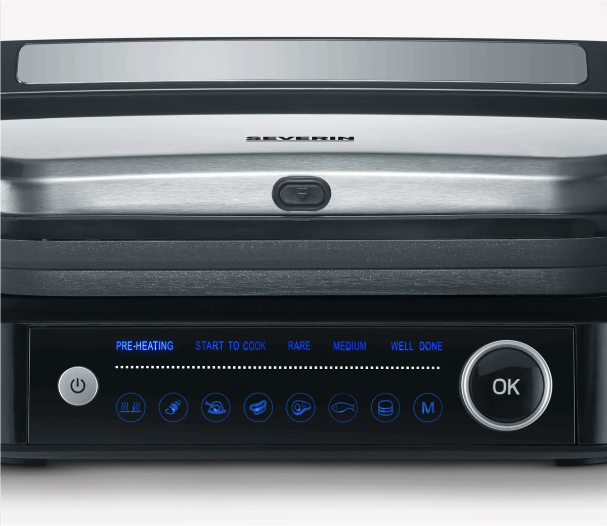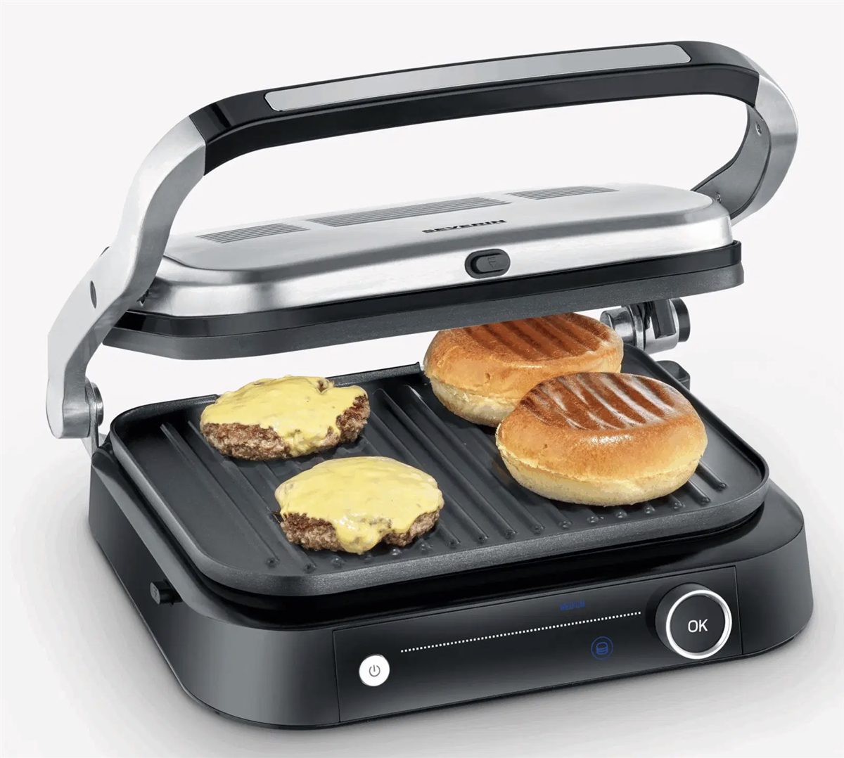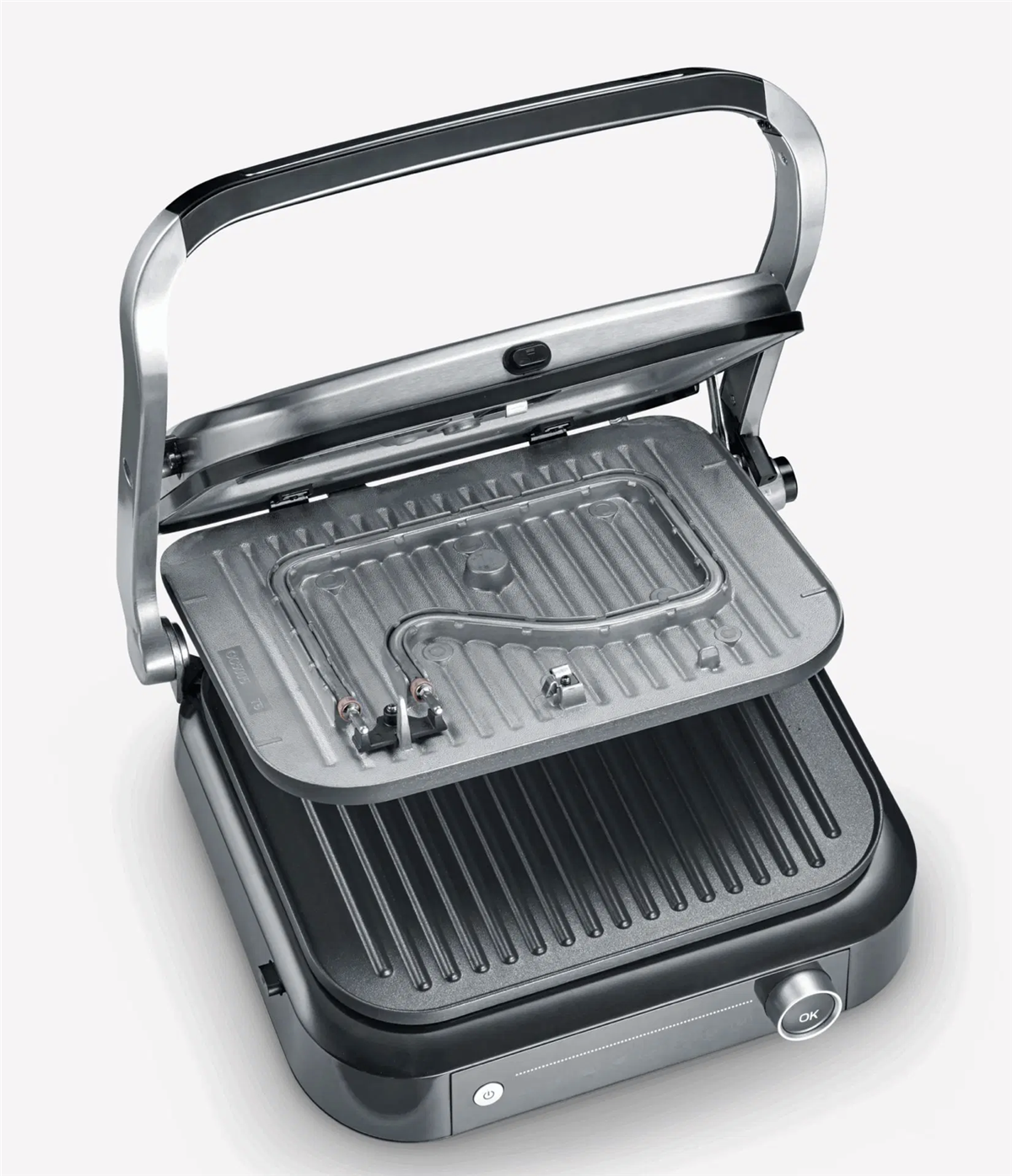 "Bistecchiera Potenza: 1.800 W, Temperatura max: 230°C, superficie di cottura : 31,3 x 24,5 cm, 7 diversi programmi automatici ed 1 manuale. Il sensore rileva lo spessore del cibo e indica il raggiungimento dei diversi livelli di cottura. Può essere utilizzato sia come bistecchiera che come grill da tavolo, grazie alla superficie apribile a 180°.Semplice da pulire grazie alla facilità con cui si possono rimuovere le piastre di cottura, lavabili anche in lavastoviglie .Interruttore accensione. Vaschetta raccogli grasso