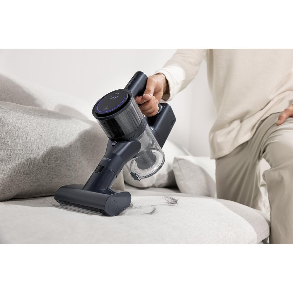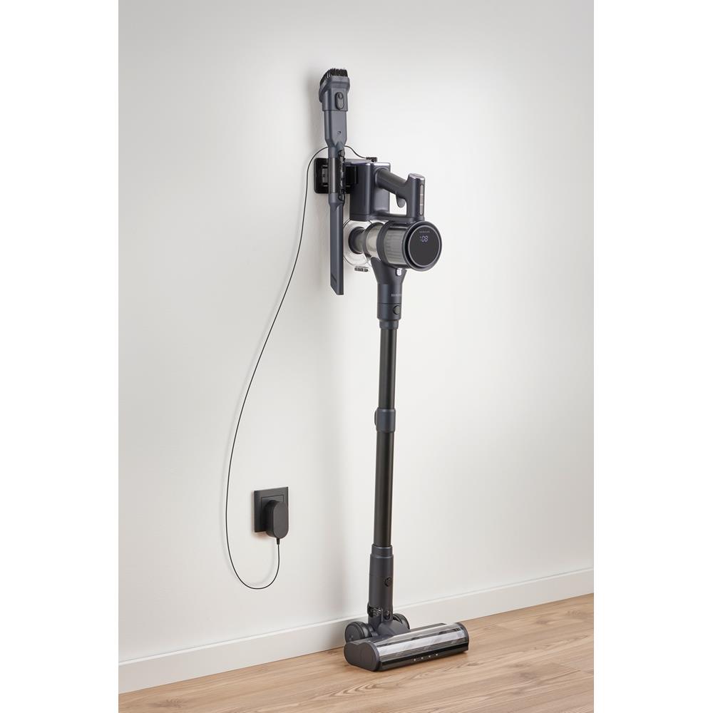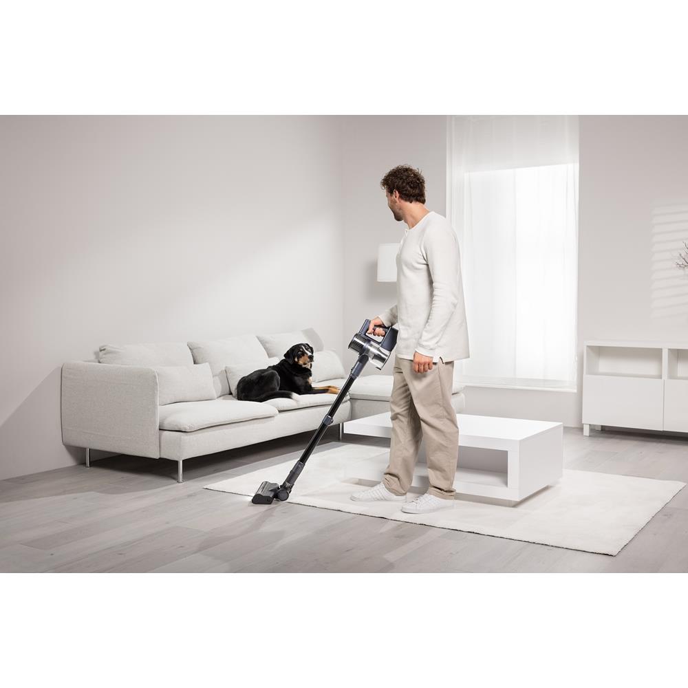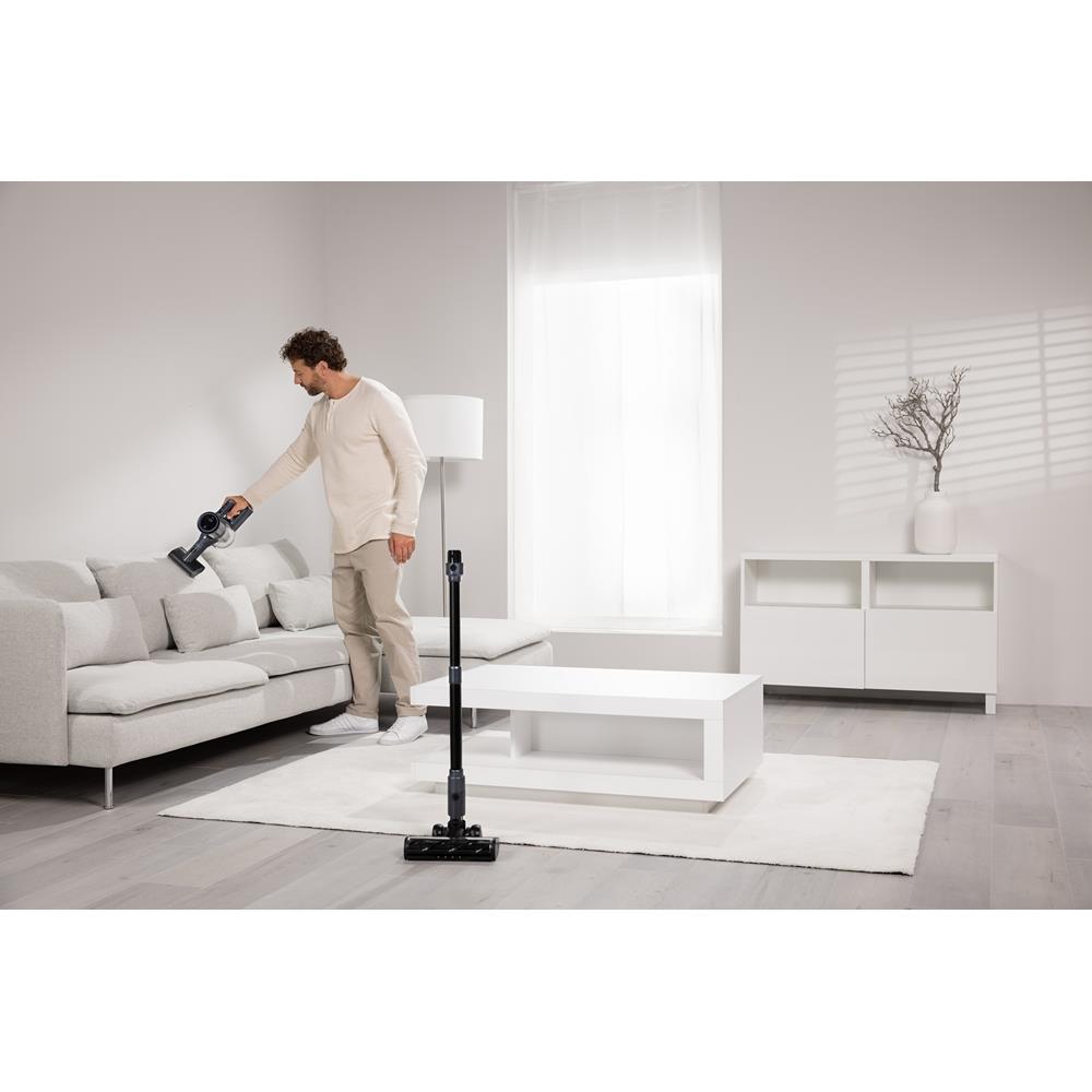 Tipo di prodotto: Scopa elettrica, Tipo di contenitore della polvere: Senza sacchetto, Colore del prodotto: Blu, Metallico. Tipo di pulizia: Secco, Emissione acustica: 82 dB, Tipo di display: LED. Alimentazione: Batteria, Massima potenza in entrata: 400 W, Potenza di aspirazione: 32000 Pa. Larghezza imballo: 700 mm, Profondità imballo: 234 mm, Altezza imballo: 205 mm. Larghezza: 150 mm, Profondità: 120 mm, Altezza: 1050 mm