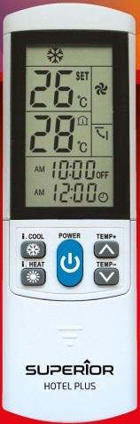 Due modalità di programmazione: manuale o automatica Indica la temperatura ambiente e la temperatura desiderata Design elegante grazie al suo display ampio e retroilluminato Ideale per il settore “Hospitality” grazie al suo supporto a parete (fornito nella confezione) Accensione e spegnimento del condizionatore programmabili Tasti dedicati per le funzioni di riscaldamento (“i.COOL” – 26° C) e raffrescamento (“i.HEAT” – 20° C).
