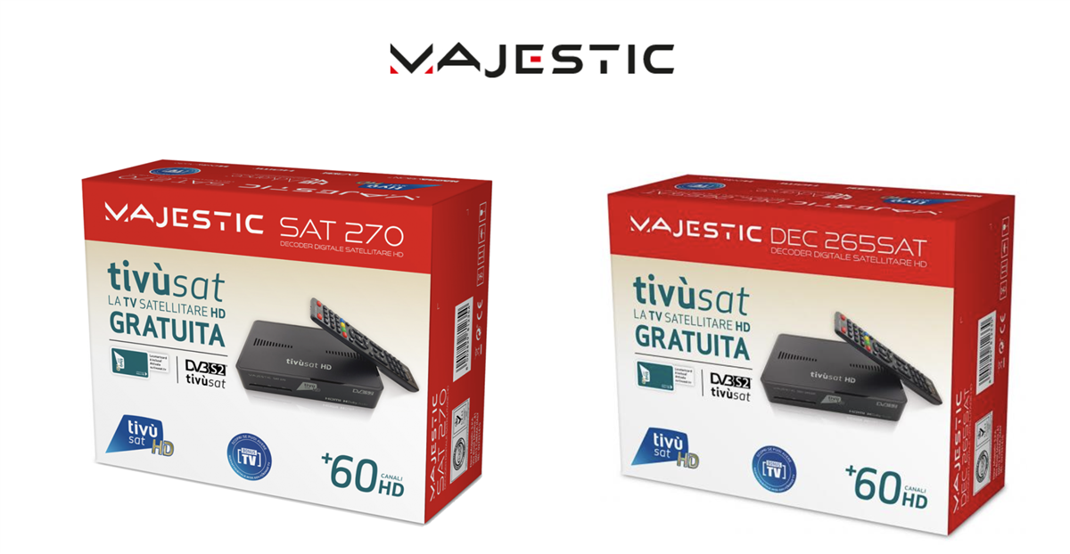 SAT 270 Majestic e` un decoder digitale satellitare tivu`sat ad Alta Definizione di ultima generazione, che da` accesso a tutta la programmazione tivu`sat HD e Free. Il telecomando universale comanda le principali funzioni della TV. L’ordinamento Automatico dei canali, la Guida TV tivu`sat 7 giorni ne arricchiscono le funzionalita`. DiSEqC e UNICABLE e il supporto dCSS ne garantiscono la compatibilita` con gli impianti di antenna piu` diffusi. L’ ingresso USB permette la riproduzione di contenuti multimediali. L’aggiornabilita` via antenna e via USB garantisce un decoder sempre aggiornato alle ultime novita`. La smart card HD e` inclusa nella confezione. Ricezione di canali satellitari Tivu`sat e Free Alta Definizione Installazione automatica, facile da usare Guida elettronica dei programmi 7 giorni Ordinamento automatico dei canali Blocco bambini Aggiornamento automatico del software Media Player DVB-S/S2 Supporto HEVC 10 bit Uscite audio video HDMI e RCA con adattatore SCART incluso Uscita audio SPDIF Lettore smart card nel retro Smart card Tivu`sat HD inclusa Telecomando universale Supporto DiSEqC e Unicable SCR e dCSS Porta Ethernet Dimensioni: 18 (L) x 11 (P) x 4,2 (H) cm Peso: 250 grammi Colore: BK Conf: 8 pz