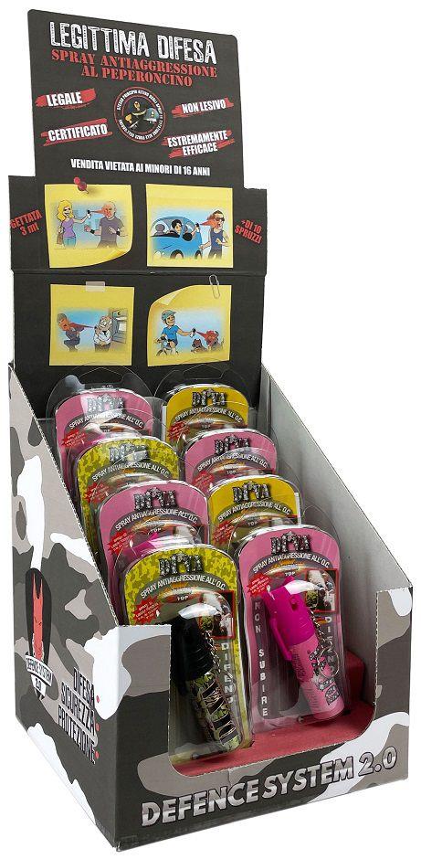 Espositore da banco contenente: N.8 Spray nella versione Classic, Pink e Camo N.8 Ciondoli portachiavi in metallo già applicati ai dispositivi. Lo spray antiaggressione al peperoncino Di.Va. TOP rappresenta la soluzione più potente della linea DIVA proposta dalla Defence System. Estrema maneggevolezza, massima sicurezza e grande efficacia ad un prezzo davvero piccolo piccolo grazie al kit risparmio pensato per la difesa della tua famiglia e dei tuoi cari. - Getto Conico - N° getti 20 - Raggio d'azione fino a 3 metri - Contenuto 15 ml Prodotto Legale Vietata la vendita ai Minori di 16Anni