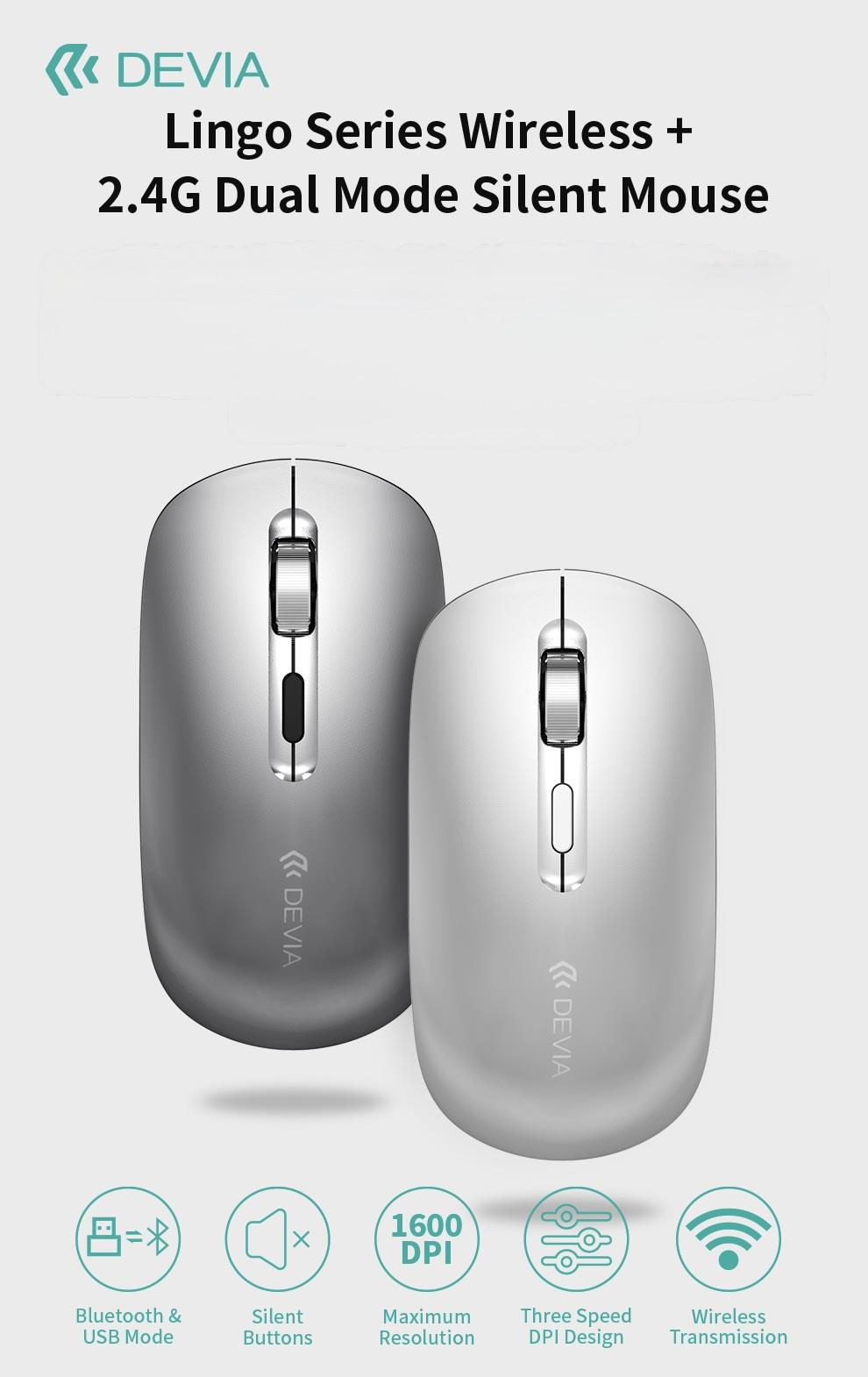 Operazioni fluide e reattive Supporta la commutazione DPI a tre stadi 800-1200-1600, assicurando un movimento del mouse fluido e senza ritardi e offrendo una migliore esperienza di gioco. Navigazione Web 800 DPI Disegno di lavoro 1200 DPI Competizione di gioco 1600 DPI Tecnologia di trasmissione wireless 2.4G Ha un segnale stabile senza ritardi e supporta una distanza di trasmissione massima di 10 metri. Compatibile sia con la modalità wireless che con quella USB e puoi passare liberamente da una modalità all'altra con un solo clic. Mouse silenzioso wireless Lingo Series + 2.4G Dual Mode Modello: EL245 Colore: grigio siderale e argento lunare Mouse ottico a doppia modalità: BT 5.0+USB Dimensioni del mouse: 112*60*32mm Peso: 110 g (cavo incluso) Fonte di alimentazione: batteria al litio integrata da 500 mAh Pulsanti sinistro e destro: Pulsanti silenziosi Rotella di scorrimento: rotella di scorrimento in metallo Interfaccia di ricarica: TYPE-C Risoluzioni DPI regolabili: 800/1200/1600 Compatibile con le interfacce software integrate delle versioni BT 2.0/3.0/4.0 Sistemi operativi: Windows 2000/XP/Vista/7/8/10, Mac OS X, Android